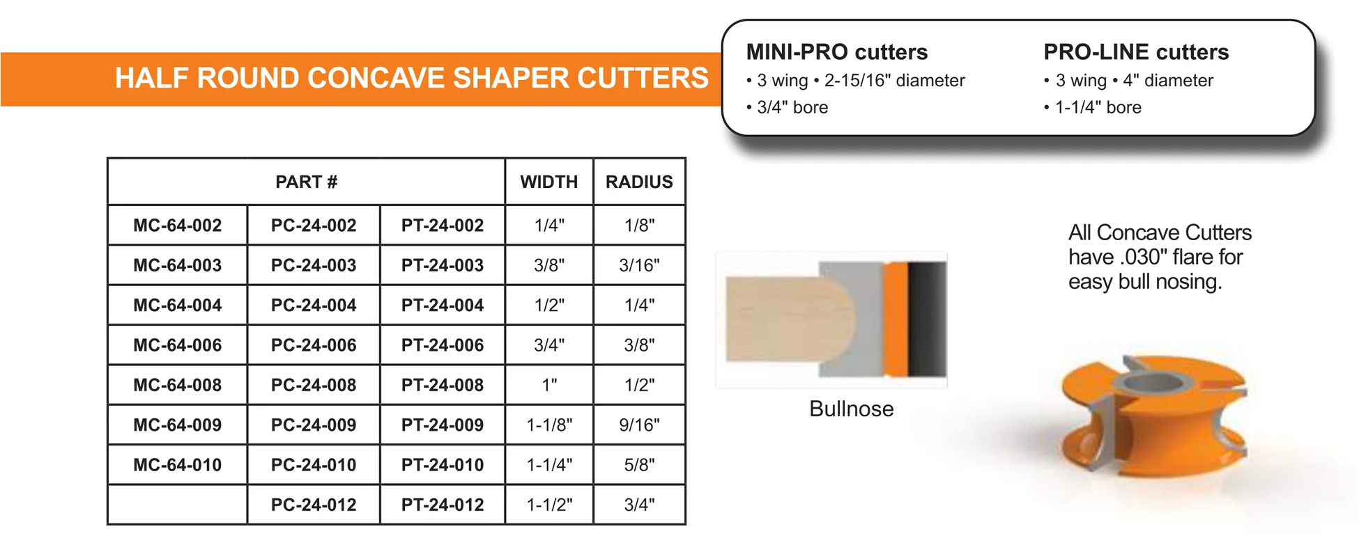 All Concave Cutters have .030 flare for easy bull nosing.